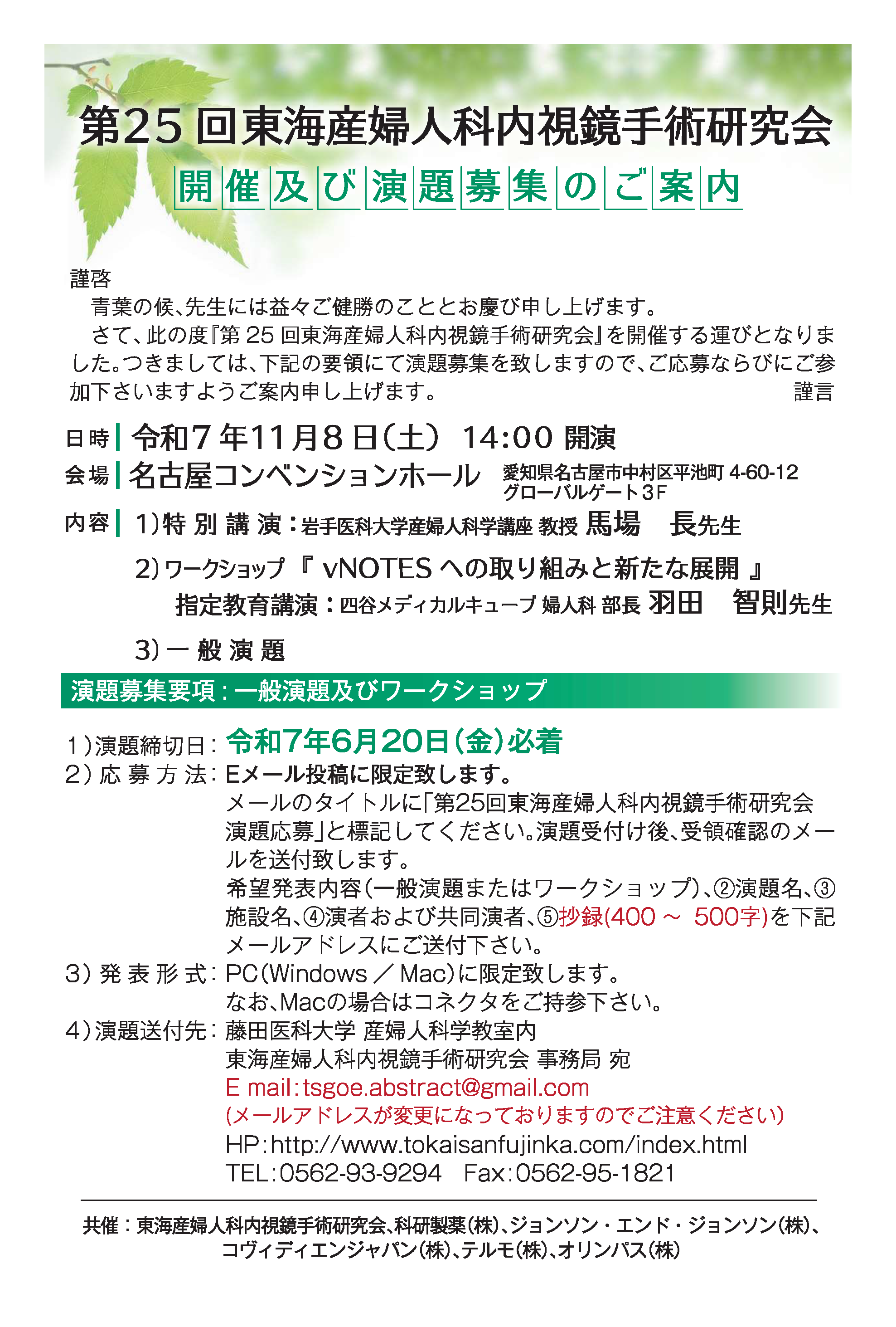 (募集終了)2025.05.29:第25回東海産婦人科内視鏡手術研究会 開催および演題募集のご案内