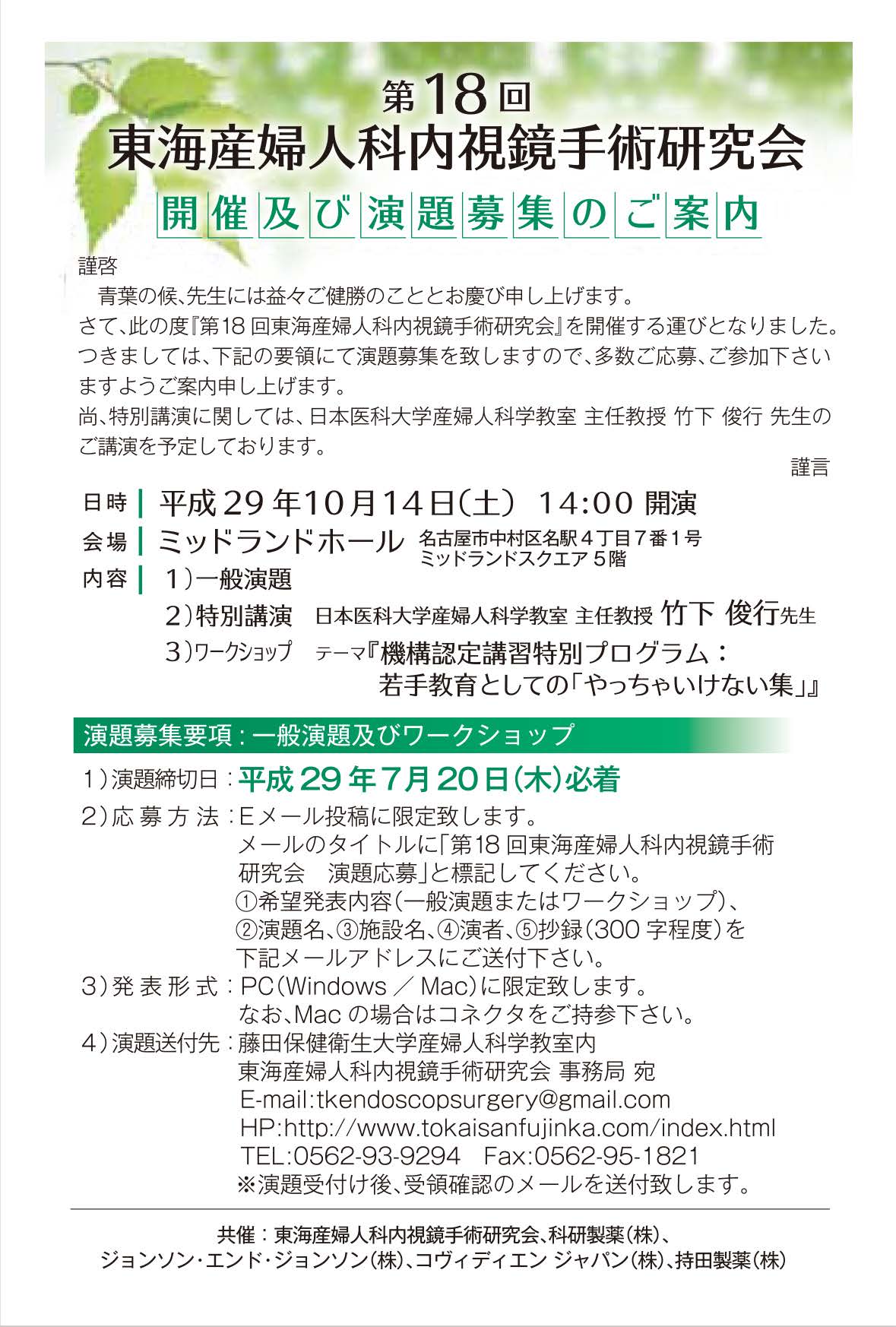 2017.05.19:第18回 東海産婦人科内視鏡手術研究会 開催および演題募集のご案内